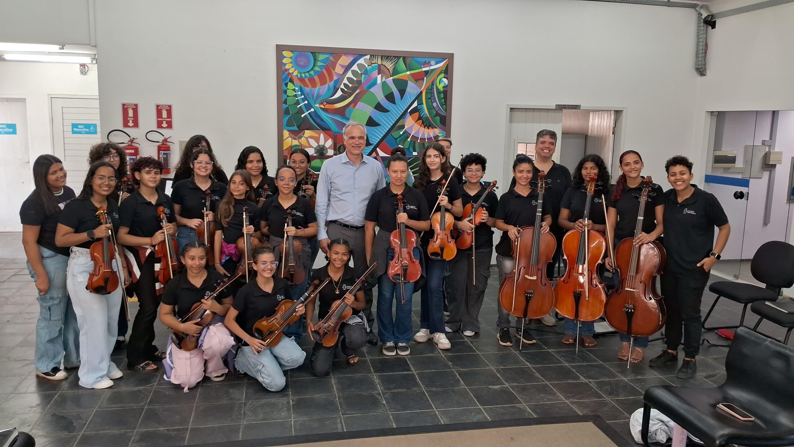 Nesta sexta-feira, 12, o reitor da UFRN, José Daniel Diniz Melo, fez uma visita surpresa às integrantes da Orquestra de Meninas Aldo Parisot, durante o ensaio na EMUFRN. O gestor, que também é aluno de violoncelo, parabenizou pela evolução do grupo e desejou sucesso na apresentação do sábado. “A UFRN tem muito orgulho desse trabalho, que promove a inclusão social e transforma a vida de jovens por meio da música e da cultura”, comemorou.