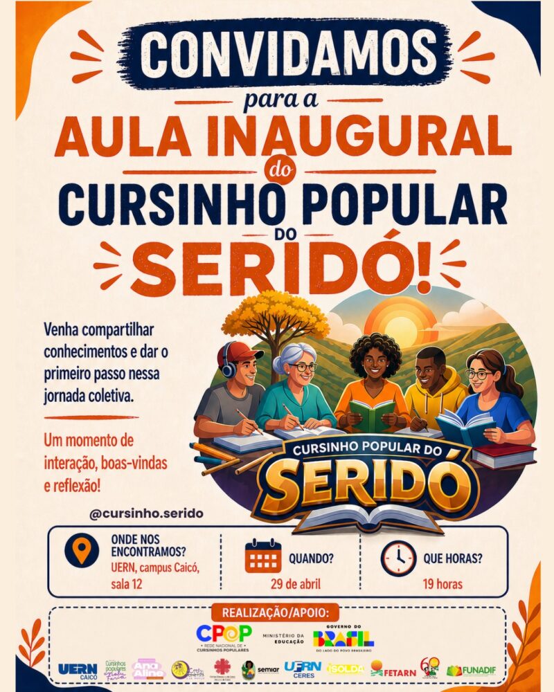 Oportunidade e transformação social marcam o início das atividades do Cursinho Popular do Seridó. A aula inaugural do projeto acontece nesta quarta-feira, 29 de abril, às 19h, na sala 12 do Campus da UERN, em Caicó. O evento será um momento de boas-vindas e reflexão para os 40 alunos selecionados nesta primeira etapa.