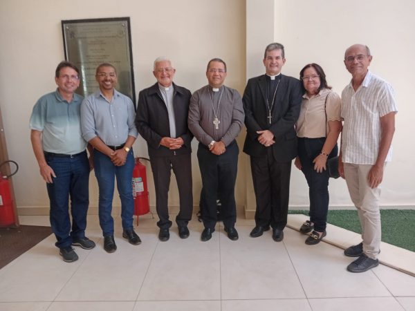 No registro, o arcebispo metropolitano da Arquidiocese da Paraíba, Dom Manoel Delson, e o seu bispo auxiliar, Dom Alcivan Tadeus, ao lado do bispo de Caicó, Dom Antônio Ranis, e de membros da comissão.