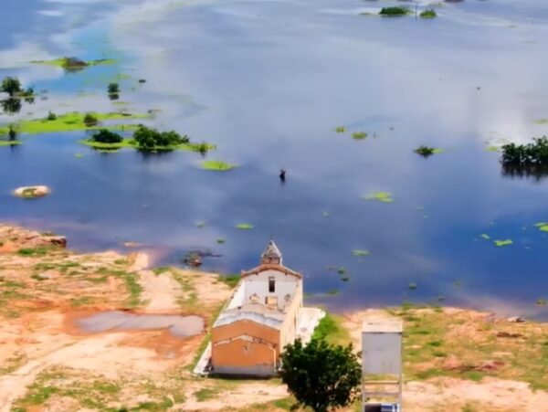 Registros recentes da cheia de 2026 revelam um cenário de melancólica beleza: a antiga igreja da vila, outrora centro da vida social e religiosa, agora repousa parcialmente submersa. O contraste visual é absoluto, marcando o encerramento de um ciclo secular diante da nova realidade hídrica do estado.