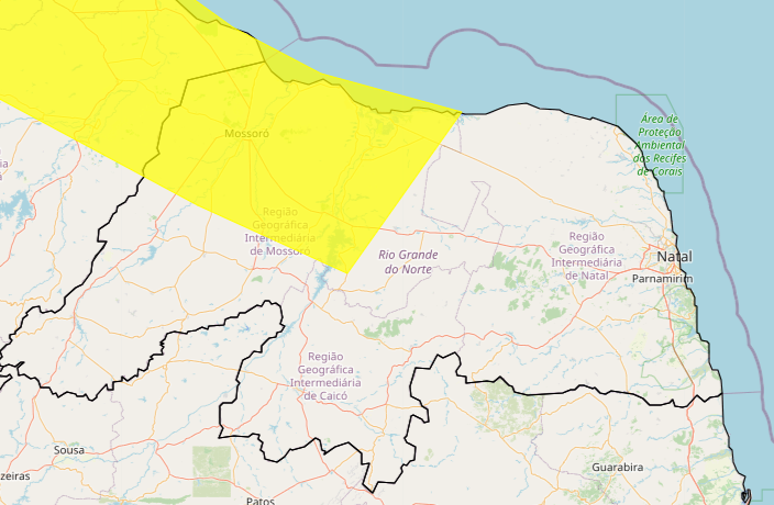 O Instituto Nacional de Meteorologia (Inmet) emitiu um aviso de chuvas intensas para 28 municípios das regiões Oeste e Central do Rio Grande do Norte. O alerta é classificado com grau de severidade “perigo potencial” e tem validade das 8h30 desta terça-feira (20) até as 23h59 de quarta-feira (21).