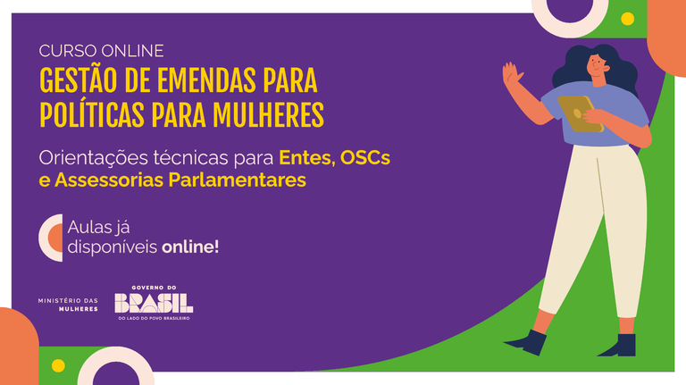 O Ministério das Mulheres disponibilizou, em seu canal no YouTube, as videoaulas do curso Gestão de Emendas para Políticas para Mulheres: Orientações técnicas para Entes, OSCs e Assessorias Parlamentares.