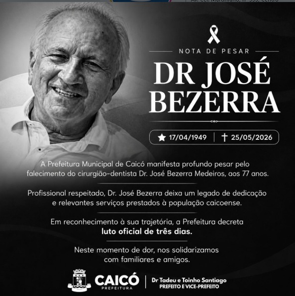 A Prefeitura Municipal de Caicó manifesta profundo pesar pelo falecimento do cirurgião-dentista Dr. José Bezerra Medeiros, ocorrido neste sábado, aos 77 anos.