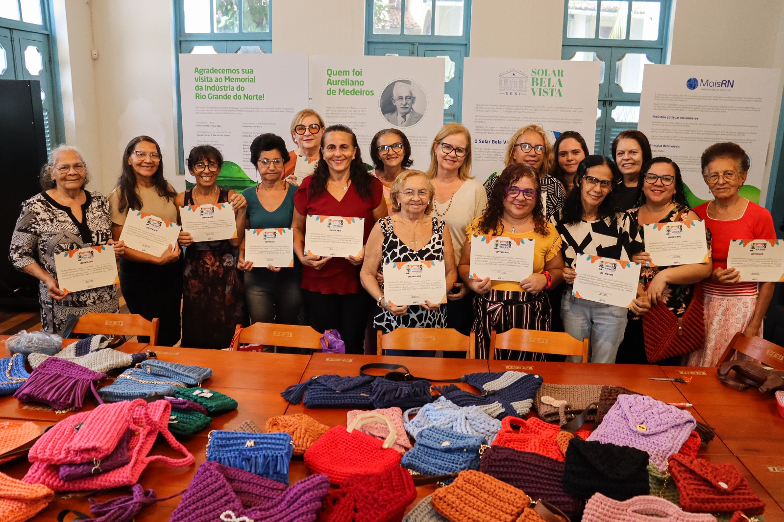 A oficina de bolsas com fio de malha realizada pelo SESI-RN foi concluída no Solar Bela Vista, localizado no bairro da Cidade Alta, em Natal, após o cumprimento do cronograma previsto. A formação foi conduzida pela professora Auxiliadora Medeiros e contou com 12 encontros, totalizando 36 horas de aulas.