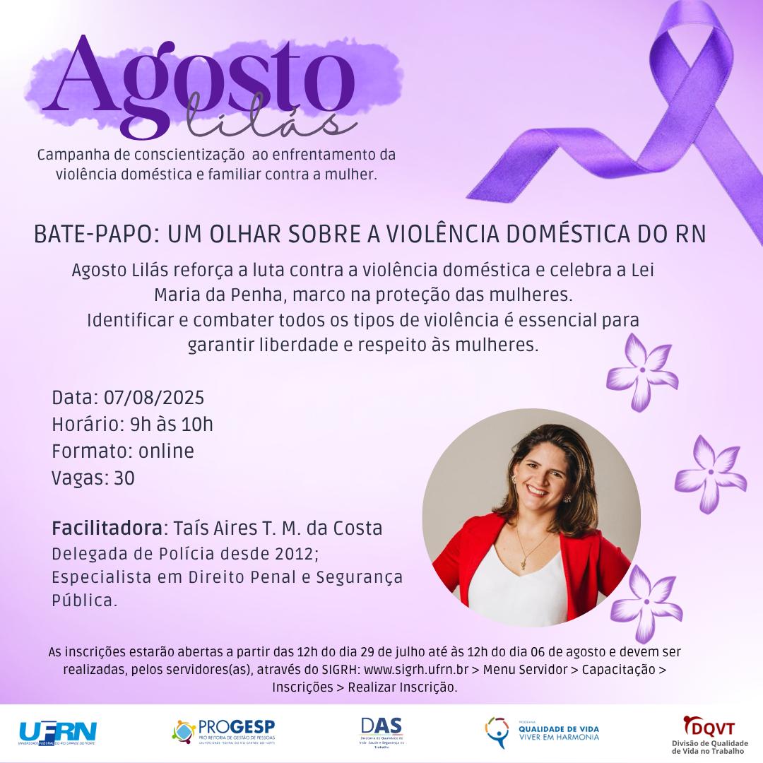 A abertura da programação será com o bate-papo Um olhar sobre a violência doméstica no RN, que acontece no dia 7 de agosto, das 9h às 10h, no formato online. A facilitadora é a delegada da Polícia Civil do RN, Taís Aires T.M. da Costa. Para ela, a violência contra a mulher é um tema que deve ser sempre debatido, especialmente no Agosto Lilás, mês em que a Lei Maria da Penha, marco no combate a este crime, comemora aniversário.